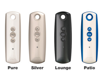 For styring av én solskjerming eller én gruppe solskjerminger. Fjernkontrollen er praktisk utformet med trykknappstyring. Opp-, ned- og stoppfunksjoner og "Min"- favorittposisjon. For at du skal kunne benytte fjernkontroll på solskjermingen din, må du denne ha motor RTS-mottaker.
